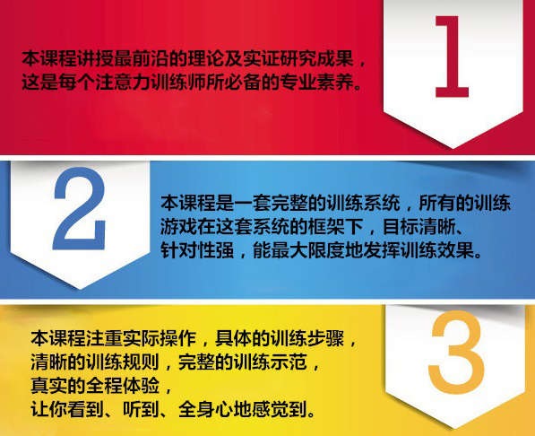 南博科学教育研究所的首席专家郭瑞立教授以国内外心理学最前沿的研究成果设计了完整的、最具操作性的一套系统的训练课程——《超级注意力训练课程》。为了满足更多的有志于讲授这套课程的各界人士,更是为了满足更多家长提升孩子注意力的需求,我们将完全公开这套课程的原理、训练系统和全部的训练方法,开设注意力训练师师资班。