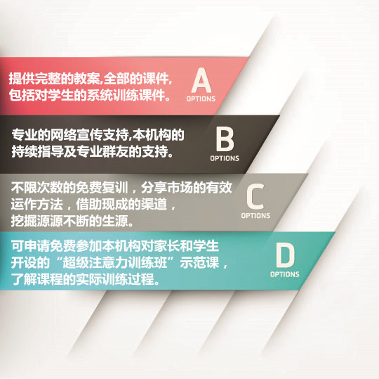 按此设计,再加上一些训练方法,即可给家长和孩子开设4天超级注意力训练班。 |